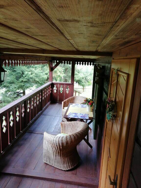 W skład domku wchodzi także wygodna weranda z meblami drewnianymi. Dom wyposażony jest w telewizor, żelazko, leżaki, ekspres do kawy, suszarki do włosów oraz grill.