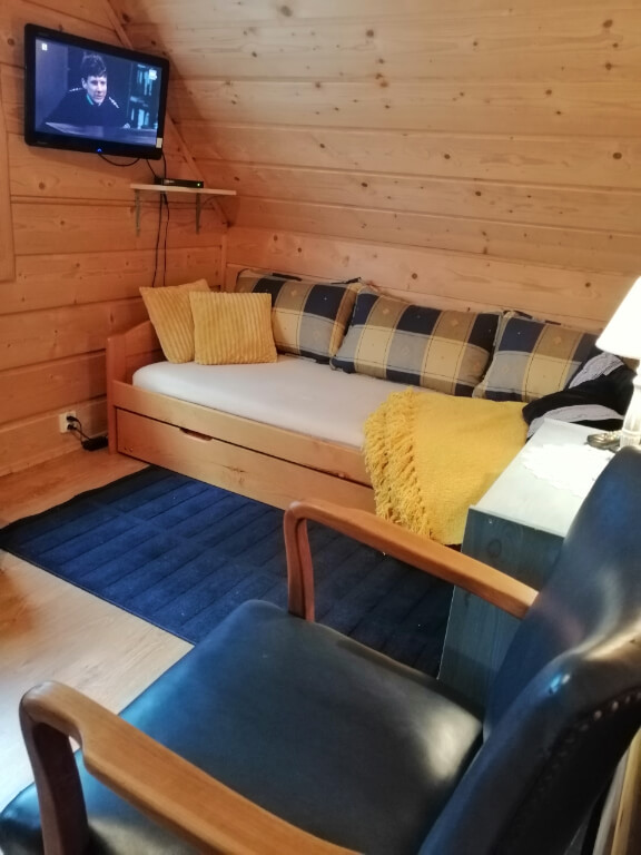 W skład domku wchodzi wygodna weranda z meblami drewnianymi. Domek wyposażony jest także w grill, radio-budzik, telewizor, żelazko oraz suszarkę do włosów i ekspres do kawy.